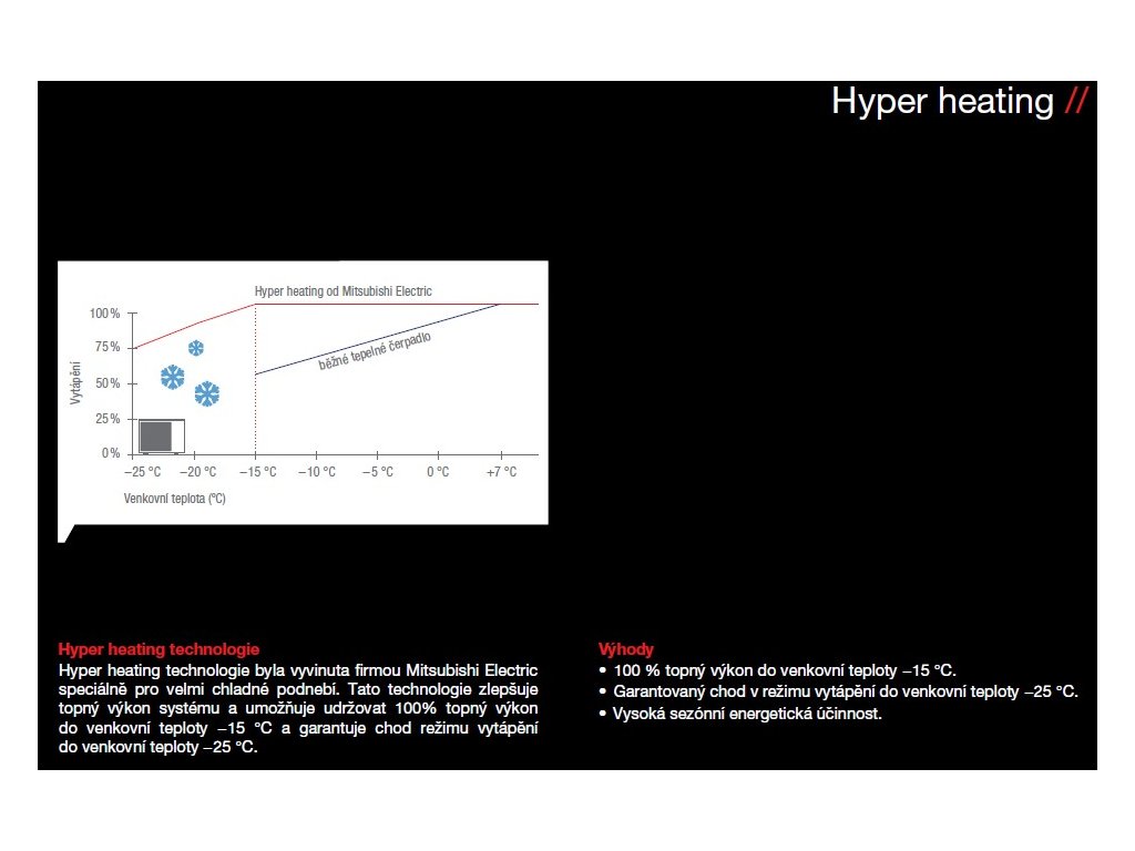 Hyper heating technologie byla vyvinuta firmou Mitsubishi Electric speciálně pro velmi chladné podnebí. Tato technologie zlepšuje topný výkon systému a umožňuje udržovat 100% topný výkon do venkovní teploty −15 °C a garantuje chod režimu vytápění do venkovní teploty −25 °C.